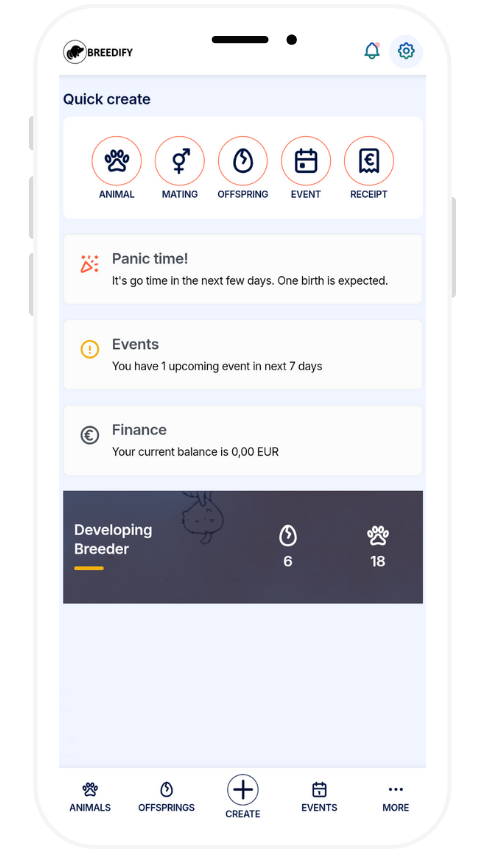 * Animal management records include all key data linked to the animal (such as offspring, matings, young animals, and health history) alongside general financial transactions in the overview.
